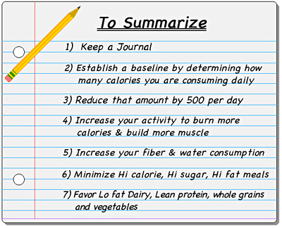 Once you have established your baseline and evaluated the calorie count of what you've been eating, you can determine what changes you are comfortable making to achieve your goal. A reduction of 500 calories a day will result in losing 1 lb a week.
